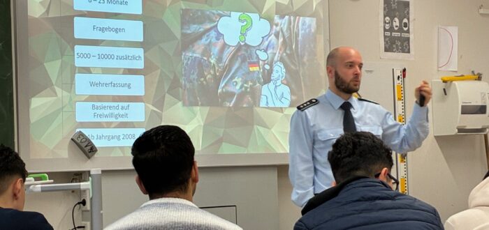 Am Donnerstag, den 30. Oktober 2025, hatte eine Lerngruppe des Jahrgangs 9 den Jugendoffizier Hauptmann Kappe vom Bundeswehr Standort Augustdorf eingeladen, um mit ihm über die aktuelle Planung der Bundesregierung zum Freiwilligen Wehrdienst zu diskutieren. Nachdem der Zeitsoldat seine private als auch militärische Vita vorgestellt hatte, wurde im ersten Teil sehr anschaulich dargestellt, warum man in der politischen Debatte über einen Aufwuchs der Streitkräfte spricht.