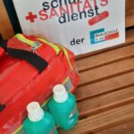 Das Bild zeigt einige Mitglieder des Schulsanitäter:innen-Teams bei der Überganbe neuer Verbandsmaterialien und Ausrüstung von den Johannitern.
