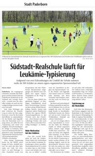 Am 21.3.2024 fand der Spendenlauf der Realschule In der Südstadt für die DKMS statt. Anlass hierfür ist die akute Erkrankung eines Mitschülers und eines ehemaligen Kollegen. Der Spendenlauf ist die erste Veranstaltung für eine groß angelegte Typisierungsaktion, die in Kooperation mit den Berufskollegs in Paderborn und Büren. Die Kosten einer Typisierung trägt die DKMS. Dabei fallen pro potentiellen Spender ca. 40 Euro an. Die Schülerschaft der RIdS engagiert sich bei dieser Aktion mit dem Erlös des Spendenlaufs. Sie unterstützen damit die Typisierungaktionen im April an den einzelnen Schulstandorten finanziell.