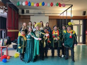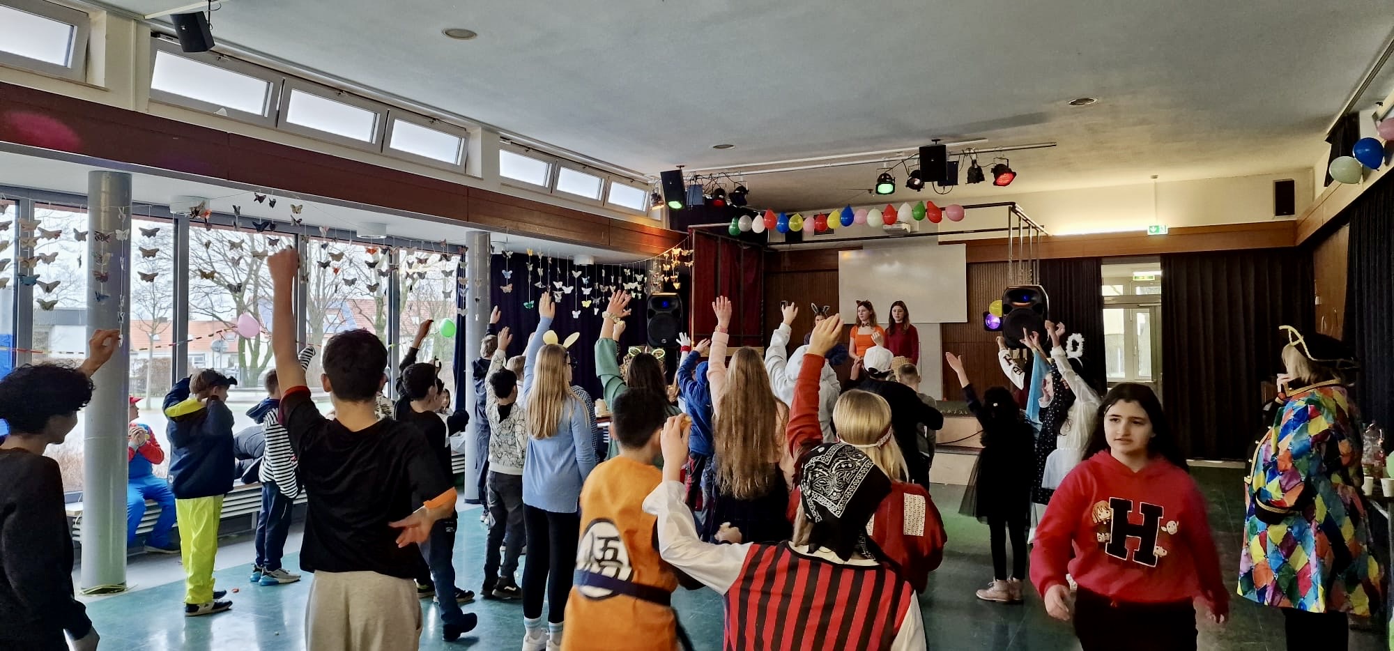 Gut 50 Schülerinnen und Schüler aus dem Jahrgang 5 & 6 feierten nachmittags in der Aula des Unterstufengebäudes am Querweg Karneval. Bereits am Tag zuvor hatte ein Festkomitee aus dem Jahrgang 10 die Aula mit Girlanden und Ballons geschmückt, die Boxen für die Musik bereitgestellt und die Tische für das bunte Buffet aufgebaut.